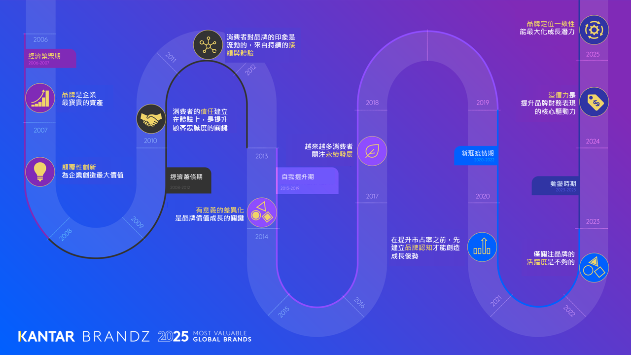 多數行銷專業人員深知,在不確定且瞬息萬變的市場環境中,品牌穩定性至關重要。Kantar BrandZ的品牌價值研究與評估,已經幫助全球各地的品牌了解行銷成效和品牌價值的發展。自1998年首次在七個市場進行調查以來,我們從長達二十年的數據中提煉出了十大關鍵洞察,旨在幫助行銷人員建立更強大且具韌性的品牌。