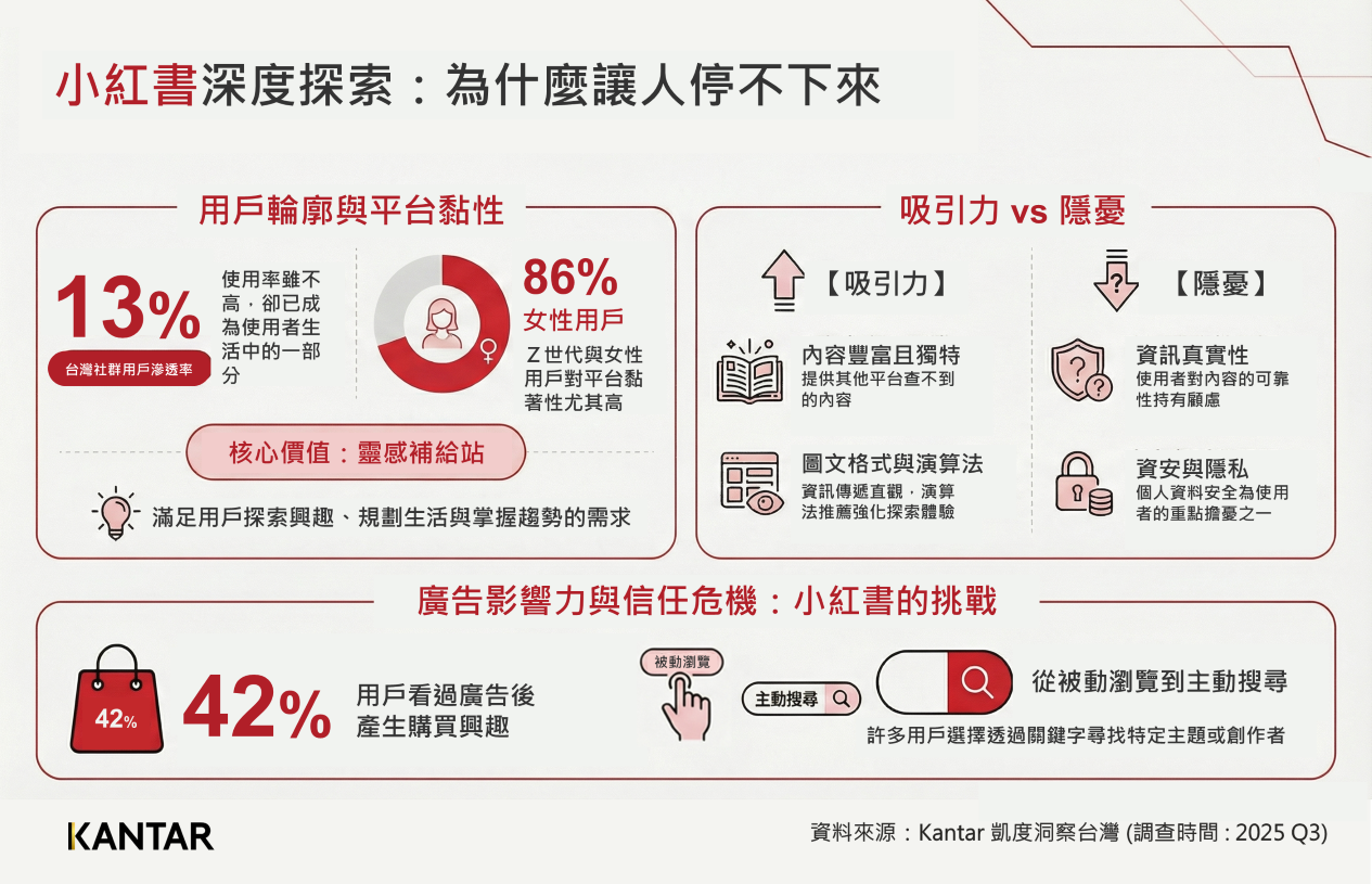 根據 Kantar 凱度台灣 2025第三季的媒體使用行為調查,雖然台灣 15 歲以上的社群媒體用戶中,僅有 13%使用小紅書,但每週使用超過210分鐘 (3.5小時) 的重度使用者就高達半數 (49%),其中絕大多數為女性 (86%), Z 世代也占了 45%,是黏著度最高的族群。