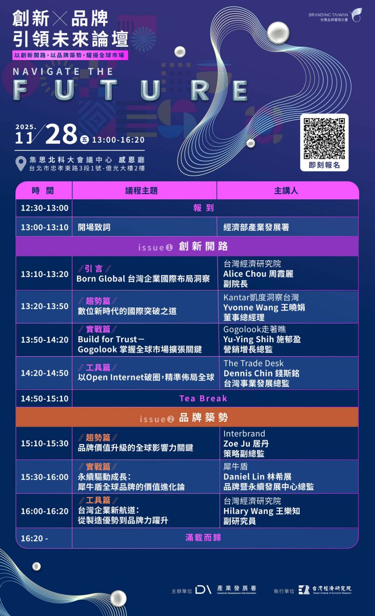 為協助台灣企業強化國際行銷布局,提升全球競爭力,經濟部產業發展署特別舉辦「2025 Navigate the Future 創新×品牌 引領未來論壇」。本論壇以「創新開路、品牌築勢」為雙主軸,邀請來自國內外的產業專家與標竿企業代表,分享國際市場趨勢洞察、創新工具應用與實戰經驗,協助企業掌握未來發展方向。透過跨域交流與知識連結,期望引領台灣企業在全球市場中脫穎而出,開創具前瞻性與永續性的國際競爭新格局。