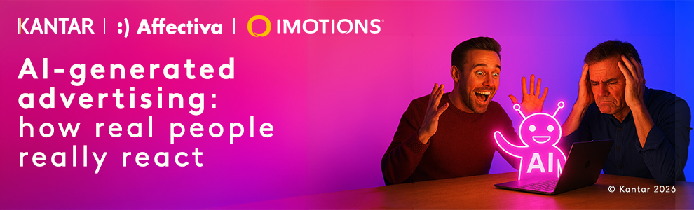 In this webinar, we unpack new evidence from Kantar and Affectiva - iMotions, combining ad-testing survey data with advanced facial coding to capture people’s instinctive reactions to AI-generated advertising. The findings are based on a global analysis of more than 350 ads using AI, tested across markets around the world.